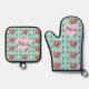 Floral Pink Rose Roses Pattern Aqua Womans Name Oven Mitt & Pot Holder Set