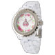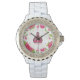 A watch for teachers featuring the logo of The Pink Schoolhouse at centre with pink floral border. Personalise with your name under schoolhouse. Numerals are pink and green.