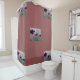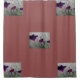 The images on the floral pink shower curtain consists of pink-purple Morning Glory wildflowers perched along a grey, wooden fence on a sunny summer's morn.