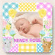 This sweet baby announcement design features a peaceful newborn photo framed by a soft pastel floral‑plaid collage. The patchwork border blends gingham, polka dots, and delicate pattern blocks in pink, blue, yellow, and purple, accented with charming illustrated flowers and adorable character motifs. The mix of textures creates a gentle, handcrafted feel with a warm, whimsical mood. Perfect for birth announcements, nursery décor, or keepsake gifts, this design pairs soft colour, playful details, and heartfelt charm.
