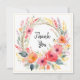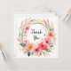Express your appreciation in floral style, with this pretty card. The beautiful flat card displays a colourful wreath of summer flowers and foliage, in a watercolor style. The words 'Thank You' are in the centre of the design, in elegant script typography. The card also has a faux gold square border. The reverse side also has the same gold square surround, and decorative blooms in the lower right hand corner. The rest of the reverse side is plain white for you to add your own handwritten message.