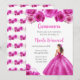 This Quinceanera invitation features a beautiful princess in a hot pink ball gown with floral arrangements. This is perfect for a Quinceanera birthday party.
