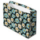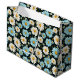 This large size paper gift bag is shown in a lovely blue and white daisy floral print on a dark colour background.