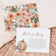 Celebrate the mum-to-be with this vintage inspired dusty rose autumn books for baby card featuring a watercolor illustration of a soft orange pumpkin with a blush pink floral bouquet and a matching floral pattern on the reverse side.