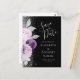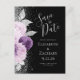 This elegant modern save the date postcard features a purple and lavender floral design trimmed with faux silver glitter. The customisable text combines handwriting script and copperplate font in silver grey on a black background. The reverse side repeats the information, along with a customisable return address.