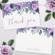 Send a heartfelt message of gratitude with this beautifully designed thank you card, featuring a soft purple watercolor floral theme. The front showcases delicate roses and flowers in a variety of purple hues, from deep purple to soft lilac and violet, paired with lush green leaves for an elegant and timeless look. "Thank You" is written at the bottom in graceful purple script, adding a simple yet charming touch.