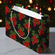 This design features a floral pattern of red Christmas berries and green foliage on a dark green background.
