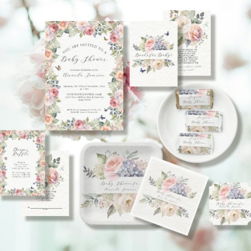 FAVOR GIFT BAGS PERSONALIZED WITH YOUR NAME AND MESSAGE | This collection features a dreamy, magical rose garden floral that is OH So Feminine! Perfect to welcome your sweet baby girl. A tiny blue butterfly and a dragonfly flit about a English cottage garden style rose bouquet in blush pink and white with hints of blue wildflowers and baby's breath. MSP0107