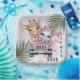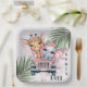 Two animated animals: a giraffe and an elephant. Both are adorned with floral crowns on their heads. The giraffe, with its long neck and spotted pattern, sits on the left side of the image, while the elephant, with its large ears and trunk, is on the right. They are both seated inside a pink vehicle, which appears to be a car. The background features soft pink palm leaves, giving a tropical or safari vibe to the scene.