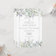 An elegant wedding invitation featuring pretty sage and lilac leaves that tumble over a geometric silver frame enclosing your wedding details set in classic elegant text. The reverse has your wedding website and RSVP details, and QR code. Designed by Thisisnotme©