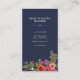 Beautiful navy blue business card for a hair stylist, featuring hand-drawn flowers in orange, red, pink, and white atop a pair of white scissors.