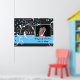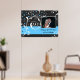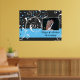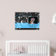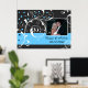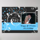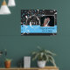 Elegant floral scroll leaf black, blue flourish wedding photo poster print, featuring white scroll leafs, swirls and curls and sky blue dots on black background. There is a blue band with your text to the bottom. The blue can be changed to any colour. Classy, stylish and chic design with your photo.