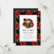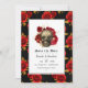 Crimson red, black and gold gothic wedding save the date featuring a skull decorated with red roses and a dramatic rose pattern.