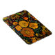 This vibrant image is a combination of a painting and digital art. It features glowing, golden-yellow and orange flowers with intricate, web-like textures. The flowers resemble roses and other blossoms, surrounded by a tangle of neon-like stems and leaves in shades of green, orange, and red. The background is dark, almost black, which enhances the luminous effect of the flowers and foliage. There are also tiny, twinkling star-like lights scattered throughout, adding a magical or cosmic feel.