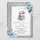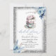 Cute baby shower invitation features watercolor blue flowers, tea cup with pink flowers, and silver glitter frame on white background. These baby shower invitations are easily customised for your event by simply adding your details.