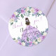 Add a whimsical and elegant touch to your party favours, candles, place settings, envelope closures, and more with this charming round sticker design! Featuring a floral theme, it showcases a mix of purple hues and cream white flowers, with soft watercolor roses accented by lush green leaves. At the bottom centre, a girl in a sparkling purple gown with a regal crown adds a royal and delightful touch. "Thank You" is beautifully written in purple script letters, creating a lovely balance of elegance and simplicity.