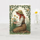 Designed with a calm, romantic countryside scene, the card shows a young woman kneeling in emerald grass sprinkled with golden-yellow wildflowers, her body set slightly off-center as if you’ve caught her in a private moment. Her auburn hair falls loose from under a straw hat trimmed with tiny white and orange blossoms, and she wears a cream blouse with a brown pinafore that softens into the warm tones around her. She looks down with a tender, almost shy focus, and her hands hover over the flowers as though she’s caring for them the way you might for someone you’re fond of 💚. A soft cream background keeps everything gentle, while an arched vine frame curls overhead with clover-like leaves and small yellow-brown blooms, adding a St. Patrick’s Day nod ☘️. Any greeting text would sit neatly in the open cream space above her, set in a medium green color that matches the leaves without crowding the illustration. The lighting stays diffused and sun-kissed, bringing out the textures in her hat brim, the folds of her blouse, and the brushed look of the grass. The border’s vine forms a rounded arch from left to right, dotted with clover shapes and tiny flowers that trace the edge like a natural garland.
