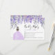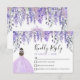 Purple Quinceañera Party RSVP Card: This elegant RSVP card now features purple watercolor lilac and lavender flowers beautifully arranged along the top of the front, with shades ranging from deep violet to light lavender. To the left side, a girl in a stunning purple sparkle dress adds a touch of charm and personalisation to the design. The back showcases flowers along the top, along with a faux glitter sparkle tiara for a touch of royalty, and space for the birthday girl’s name and "Mis Quince" in a stylish script.