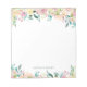 This lovely and trendy notepad features a clean white background with a gorgeous watercolor border full of flowers in shades of pink, ivory, white, and peach with lots of green and teal leaves