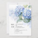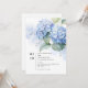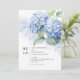 Modern and elegant. This lovely single flat wedding invitation card features a floral bouquet of fresh blue hydrangeas in full bloom, against accents of blue watercolor. A set of contemporary fonts creates a fresh modern tone.