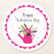 This sweet Valentine's Day paper coaster design features modern script text of Happy Valentine's Day decorated with tiny pink hearts and hot pink gardener's watering can filled with a bouquet. The scalloped pink border is optional and can be deleted if a more minimalist design is preferred. Search ID735 to see other products with this design.
