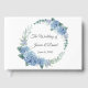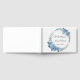 This wedding guest book is shown in a lovely watercolor floral wreath print of blue hydrangeas; text is shown in a slate grey colour.