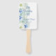 This wedding paddle fan is shown in a lovely watercolor floral print in colours of blue and white, text is shown in a dusty blue colour.