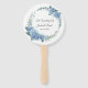 This wedding paddle fan is shown in a lovely watercolor floral wreath print of blue hydrangeas, text is shown in a slate grey colour.
