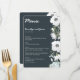 Floral wedding menu with white flowers and customisable text printed on dark background