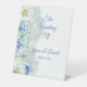 This wedding pedestal sign is shown in a lovely watercolor floral print in blue and white colours, text is shown in a dusty blue colour.
