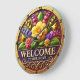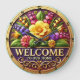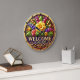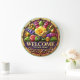 Make a prestigious first impression with the Floral Welcome To Our Home clock. This exquisite timepiece features a high-definition graphic that radiates warmth and sophisticated charm. The upper half of the face is dominated by a lush, vibrant bouquet centered around a magnificent golden-yellow camellia, surrounded by deep pink dahlias, purple bellflowers, and rich green foliage. Below the floral arrangement, the words "WELCOME TO OUR HOME" are presented in a bold, elegant golden font against a deep royal purple background, accented by intricate golden filigree. While the design masterfully mimics the dimensional texture of sculpted relief and polished gold leaf, this is a durable high-definition graphic application on a premium clock face. It is a stunning statement piece for an entryway, dining room, or as a high-end housewarming gift.