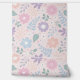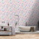 A colourful and cute wallpaper with soft pink, blue, green and purple flowers and greenery. Create a soft colour palette for a nursery or toddler room. All in pastel hues perfect for girls room with a whimsical boho design.