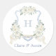 Floral White Elegant Dusty Blue Crest Envelope Classic Round Sticker