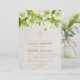 This elegant floral baptism invitation has, in its upper part, white lilies (and a few other, small white flowers) and a gold cross under them, above the text, on a white marble background. The name of the child is written in an elegant calligraphic script All text has a golden yellow colour.
