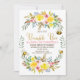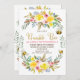 Sweet bumble bee themed birthday invitation for a little girl featuring a lovely mostly yellow floral wreath and three cute bumble bees. The design also includes a removable faux gold image heading.