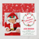 Christmas photo birth announcement card featuring a beautiful red and green floral wreath. Add all your lovely details on this easy-to-use template and adorn this card with your baby's photo to make it a one-of-a-kind announcement. Flip the card over to reveal an elegant red and white snowflakes pattern on the back of the card.