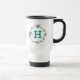 Stylish white travel mug, with graphics of a sweet colourful floral wreath, on both sides. A bold turquoise single letter monogram, inside the floral wreath, is ready to personalise. Great gift idea.