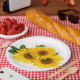 These charming floral plates features vibrant yellow sunflowers nestled in lush green leaves highlighted against a crisp white background.