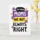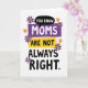 Designed with a tall, graphic layout, this card stacks a cheeky message in big, easy-to-read lettering. “YOU KNOW” sits near the top inside a black speech bubble, like a quiet aside shared between friends ❤️. Just below, “MOMS” appears in white letters centred on a purple rectangle, giving it strong visual focus without feeling harsh. “ARE NOT” is placed next on a bright yellow rectangle, adding a sunny contrast that keeps the tone light and teasing. The line “ALWAYS RIGHT.” lands at the bottom in plain black type on the white background, delivering the joke with a dry, matter-of-fact finish. Around the words, small flower shapes in deep purple with yellow centres and a few orange blooms soften the geometry and add a gentle, caring touch 🌼. The blossoms are scattered near the corners and along the sides of the stacked text, framing the coloured shapes without covering any letters.