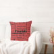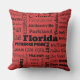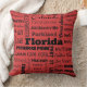Decorative pillows are a stylish way to add personality to any home. This one shows a collage of names of popular towns and cities in Florida in black on lipstick red, and the back is solid black.