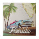 Beautiful illustrated map of the state of Florida and islands in the region in a beautiful vintage style featuring a retro 1950s car.