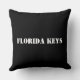 A charming pillow featuring the name of Florida Keys and some of its popular locations in black text of varying fonts and sizes on a light aqua blue background. The back is solid black with the words "Florida Keys" in white. Just flip the pillow to quickly change out the look of your room.