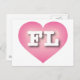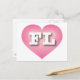 This postcard features a vibrant pink heart with a white washed centre containing the bold white upper case letters FL, the official abbreviation for Florida, the sunshine state. The reverse side of the postcard is blank, awaiting your handwritten sentiments or customised text.