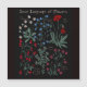 Floriography: love language of flowers from victorian age in a modern design, with sweet pea, daisy, poppy, bluebell, mistletoe on a black background. Great wildflower herbarium print art design for a bohemian interio, as a gift for valentine, for a girls room or as a funny wedding gift. In the colours sage blue red white pink and black, great botanical dark wildflowers design with handwritten messages at each flower.