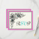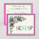 Flourish vine black pink turquoise wedding RSVP response/reply card, featuring a black vine with flowers with turquoise blue centre, a double black and hot pink border and an elegant formal script font on ivory/ecru background. A contemporary, floral design with a touch of vintage, perfect for a modern or traditional spring or summer wedding. This stylish design can be used for other special occasions such as birthdays, engagements or anniversaries.
