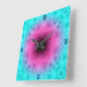 Digital art design in an abstract symmetrical pattern of shades of light blue, pink and purple that resembles looking down into the centre of a flower. Custom-designed blue numbers at hours 3, 6, 9, 12.