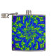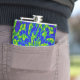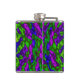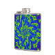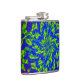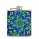This colourful hip flask features a wild abstract circular floral mandala pattern of luminous greens and blues swirling around a central flower. Purple and magenta swirls are on the back.