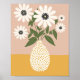 Flower Arrangement In Vase - white daisies and green leaves in vase on a mustard yellow background.