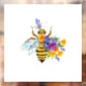 Artistically drawn, flower, honey bee with contrasting colors, yellow, bright, blooming california poppy and blue wild plants on white background.