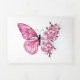 Flower arrangement of pink butterfly with pink Japanese cherry blossoms on white background.